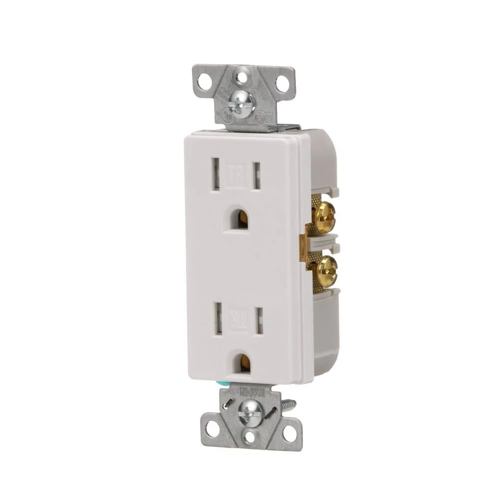 - White finish commercial grade decorator duplex receptacle offers 15A, 125V capacity designed to provide a dependable, long lasting user experience while increasing speed and efficiency of installation